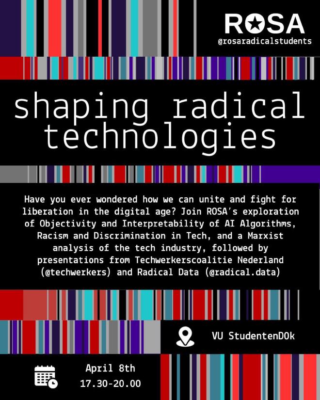 Doe op 8 april om 17:30 uur mee met een educatief evenement Shaping radical technologies (Radicale technologieën vormgeven)! We zullen de problemen van technologie onder het kapitalisme vanuit een marxistisch perspectief belichten en elkaar motiveren om technologie opnieuw in te zetten voor revolutionaire strijd! Er zullen presentaties zijn van Radical Data en Techwerkers! De presentaties zullen ingaan op de verbanden tussen AI, de waarde en toekomst van arbeid, en ze bieden een kritische maar proactieve benadering om alternatieve waarden in technologie in te bedden.